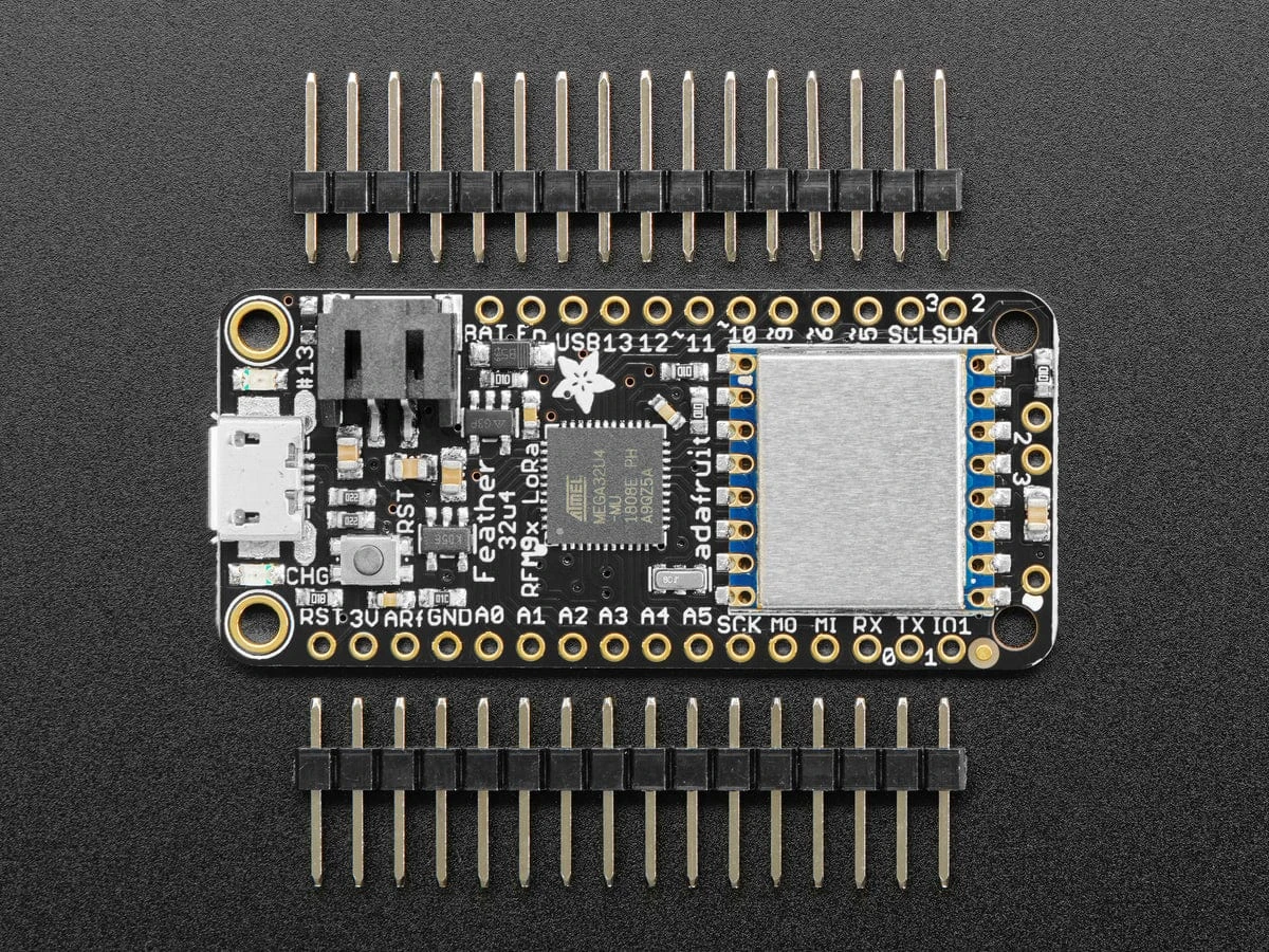 This Feather 32u4 LoRa Radio uses the extra space left over to add an RFM9x LoRa 433 MHz radio module. These radios are not good for transmitting audio or video, but they do work quite well for small data packet transmission when you need more range than 2.4 GHz (BT, BLE, WiFi, ZigBee).