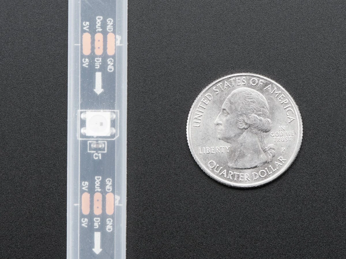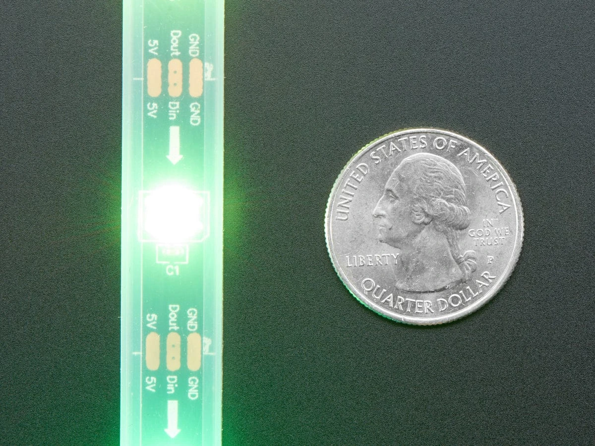 NeoPixels are addressable LEDs. That means, there are 30 RGB LEDs per meter and the strip is a full meter long so you get 30 individually-controlled RGB LEDs! You can set the color of each LED’s red, green and blue component with 8-bit PWM precision (so 24-bit color per pixel). The LEDs are controlled by shift-registers that are chained up down the strip so you can shorten the strip if you like by cutting it. Only 1 digital output pin is required to send data down. The PWM is built into each LED-chip so once you set the color you can stop talking to the strip, and it will continue to PWM all the LEDs for you.