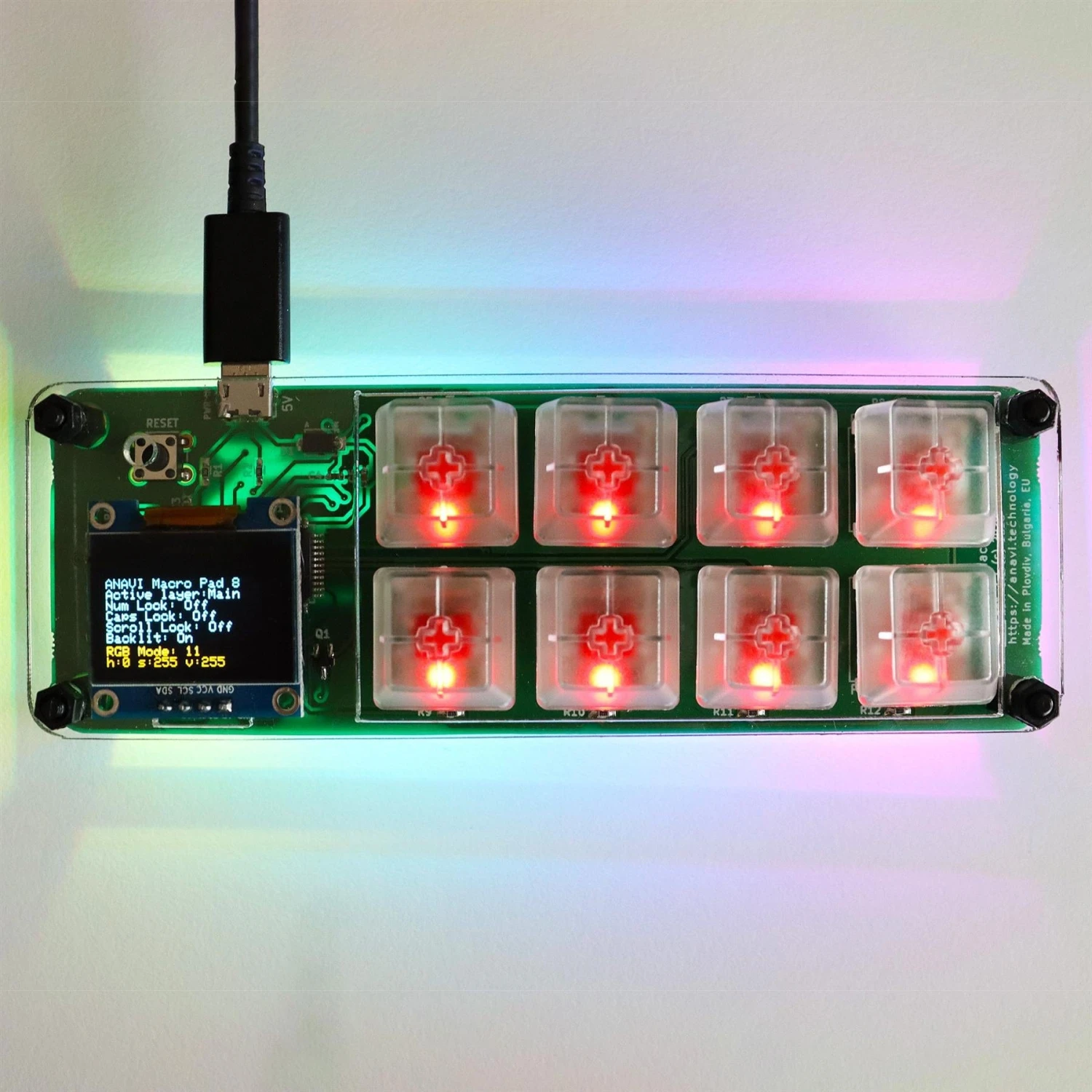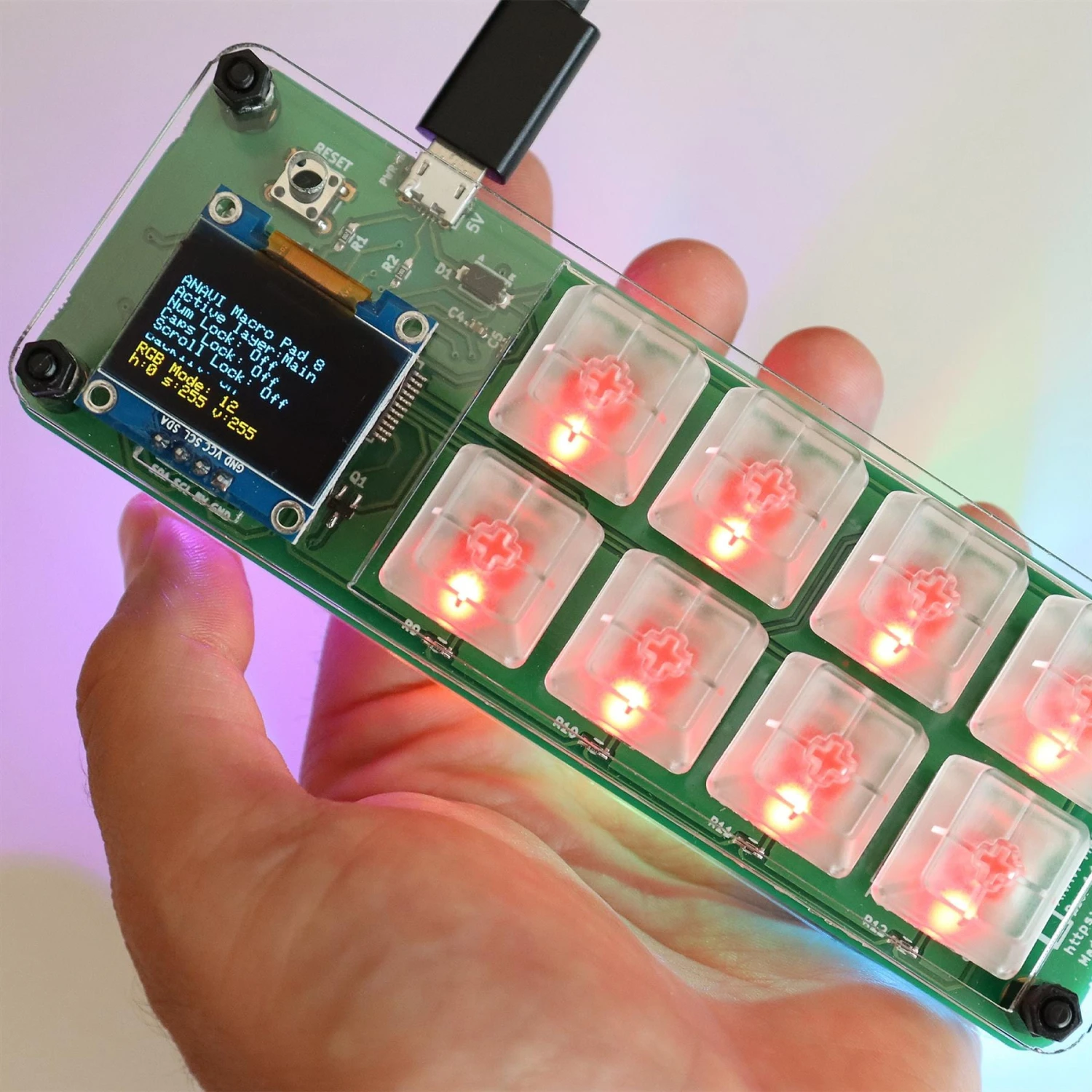 The Anavi Macro Pad 8 Kit is an open-source, programmable mini eight-key mechanical keyboard/keypad with LED-backlit keycaps, NeoPixel-compatible WS2812B underlighting, 0.96″ OLED display and acrylic enclosure!