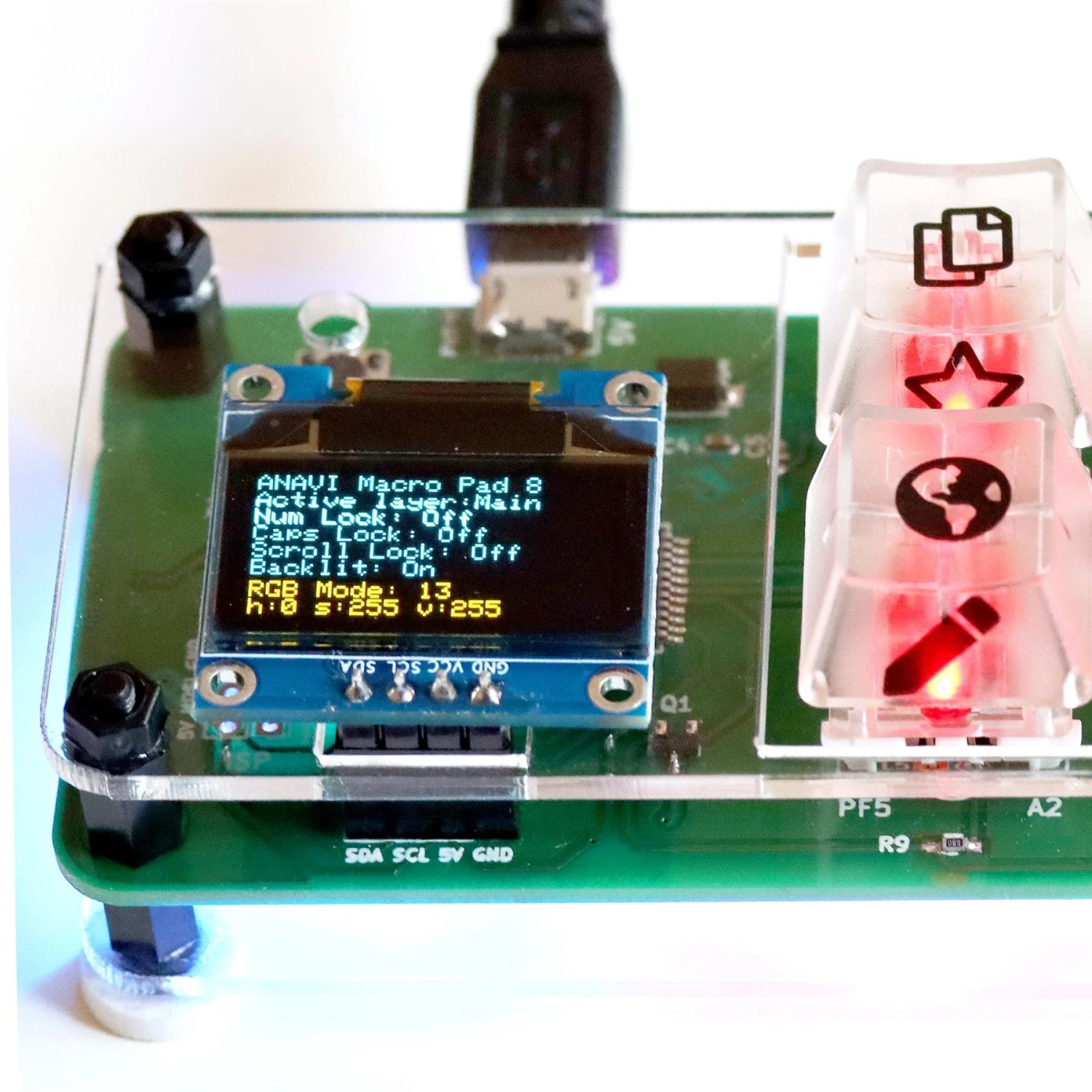 The acrylic enclosure gives your ANAVI Macro Pad 8 protection, lifts the board off the table so the underlighting is maximally effective, and helps keep the board in place with four rubber feet. The acrylic panels are screwed together easily with included hardware. The 0.96″ mini OLED display connects with the board over an I²C interface. A short extension cable is also included if you’d rather have the display slightly separate from the board. The display can be programmed with whatever information you want through Arduino IDE.