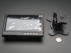 There’s some little buttons on the front that let you enter a menu system for adjusting brightness, color and contrast. It auto-detects which input you have and switches to that one or you can ‘select’ from the menu which to display. It comes with a basic stand (shown) and there are four ‘mounting thread’ holes in the back in a 75mmx75mm square and you can use M4 screws to attach it to an enclosure. There’s also a “Camera Mount” 1/4-20 hole in the bottom so you can attach it to a camera-ready mount.