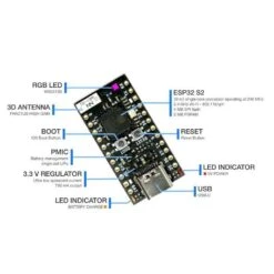 - Four indicator LEDs and one NeoPixel, on the front edge of the PCB, for easy debugging. One green power LED, two RX/TX LEDs for data being sent over USB, and a red LED connected. Next to the reset button there is an RGB NeoPixel that can be used for any purpose.