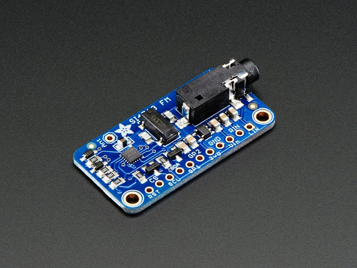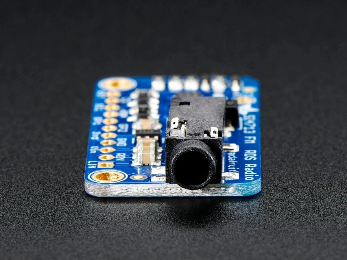 Wire up to your favorite microcontroller (we suggest an Arduino) to the I2C data lines to set the transmit frequency and play line-level audio into the stereo headphone jack. Boom! Now you are the media. Listen using any FM receiver such as your car or pocket radio receiver – this is an easy way to transmit audio up to about 10 meters / 30 feet away.