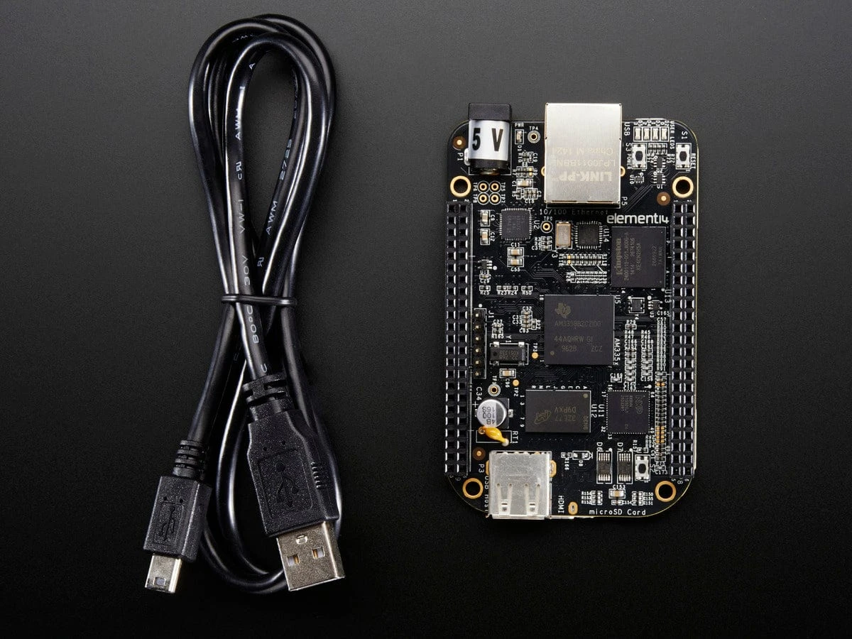 The rev C comes with a mini-B cable for powering it up ASAP. No microSD card is included as the BBB has onboard flash storage – and no SD card loading is required to get started. Please note the PCB may say rev B, that’s normal! The rev C has more memory which did not affect the PCB revision code.