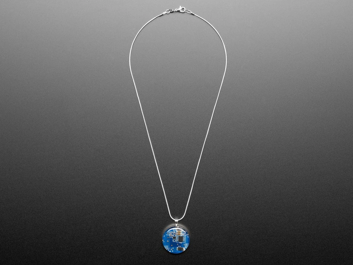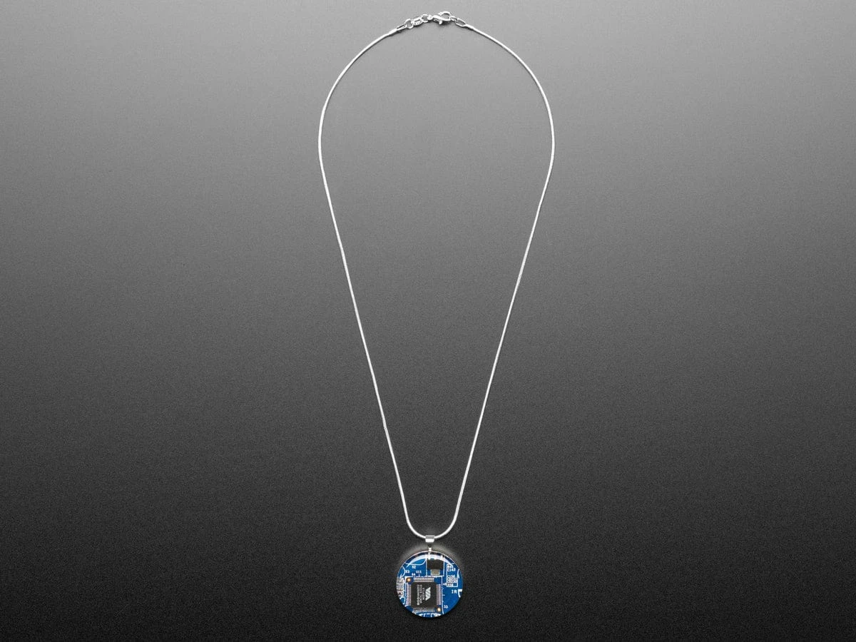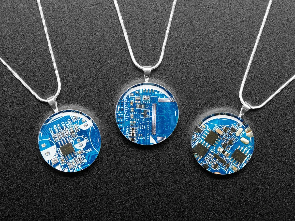 The pendant measures about 1.25″ diameter and hangs on an 18″ silver plate snake chain. The circuit board is topped with clear epoxy resin that gives it a magnified, domed appearance.