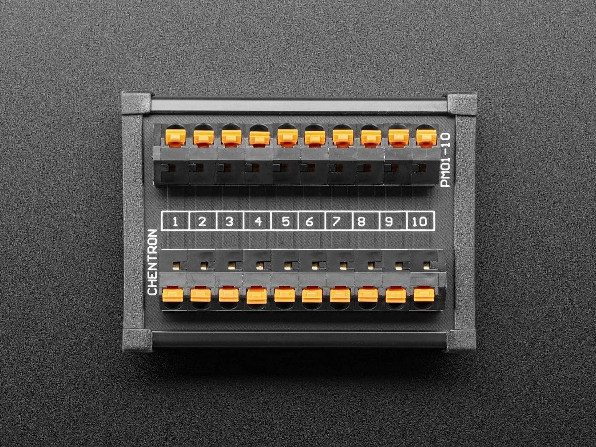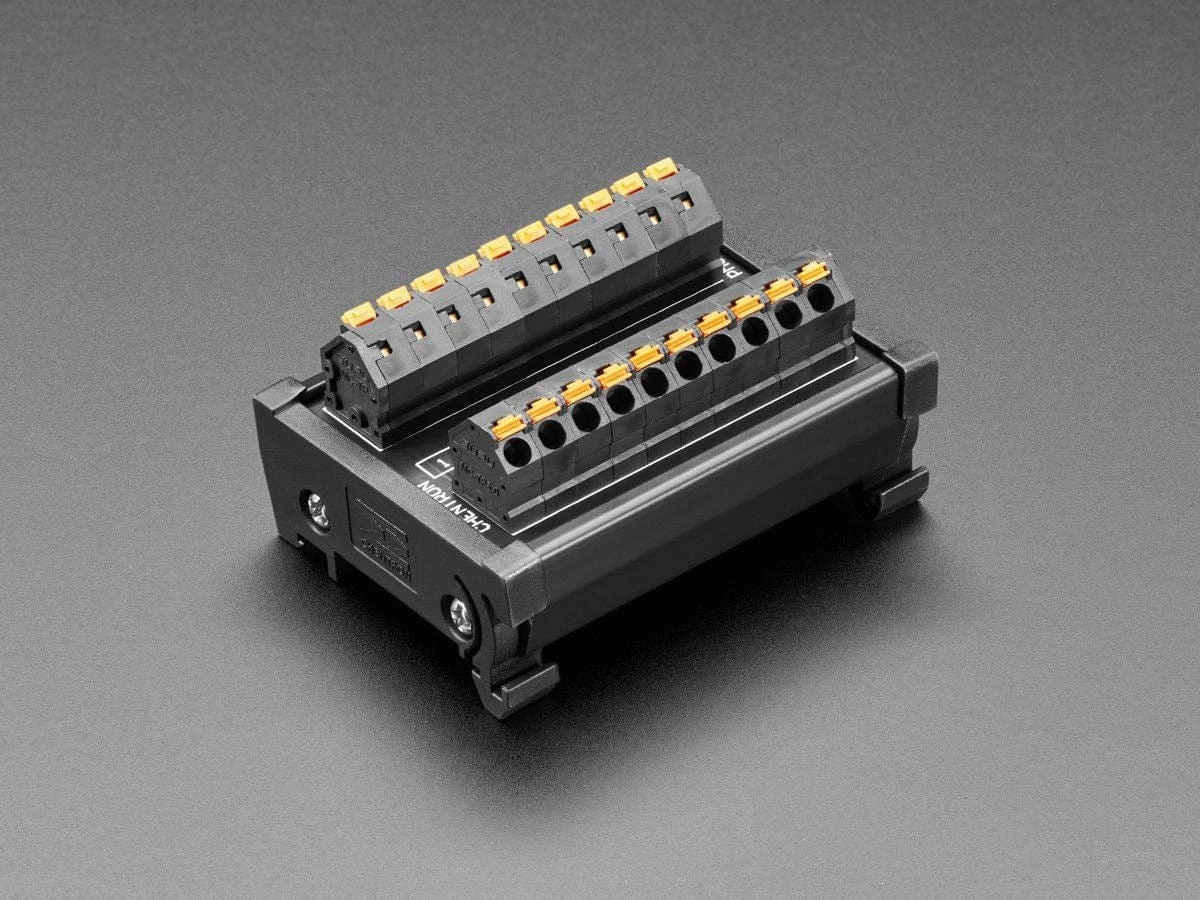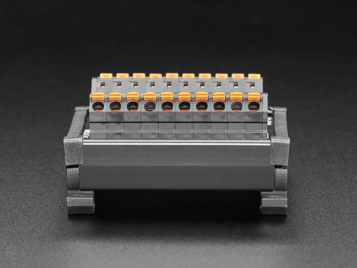 This one’s going out to all the makers and designers who use DIN railing in their builds. This adapter plate is perfect for simplifying complex wiring. There are 10 spring-terminal blocks on either side of the PCB, and they are connected straight through.Â