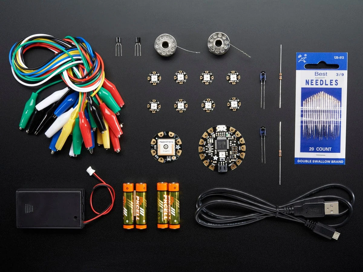Get started with the fabulous Adafruit Flora platform with this lovely starter kit. Included are plenty of parts to make a few different fun projects! There’s a Flora motherboard, a GPS module that can also perform location datalogging, eight ultra-bright chainable RGB pixels, a battery holder and batteries, two types of our high quality stainless steel thread, alligator clips to help you test out your parts, a USB cable for reprogramming the Flora, and some parts to make a wearable remote control (or TV-B-Gone!): NPN transistors, long range IR LEDs, and matching resistors.