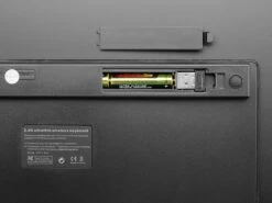 It’s a full QWERTY keyboard with a wireless USB dongle and is compatible with all operating systems. We tried many keyboards to find one that felt good for every-day use and didn’t take up too much room.