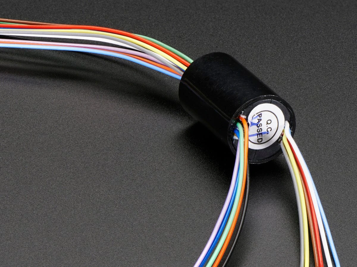 Inside the miniature plastic tube is a gold plated slip ring for 12 wires. There are twelve color coded wire sets made of 28 AWG and no matter how you twist the assembly, they will remain in continuity. Each of the wire sets can carry up to 2A at up to 240VAC or 240VDC. This model is the tiniest slip ring you can get, a mere 20mm long, 12mm diameter. Rated to rotate up to 300 RPM (but you can probably go faster if you don’t mind a reduced life and/or noise).