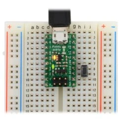The A-Star 32U4 Micro is a tiny programmable module featuring the ATmega32U4 AVR microcontroller. It packs a Micro-USB interface and 18 digital input/output pins (of which 7 can be used as PWM outputs and 8 as analog inputs) onto a board measuring only 1″ × 0.6″ and ships preloaded with an Arduino-compatible bootloader.