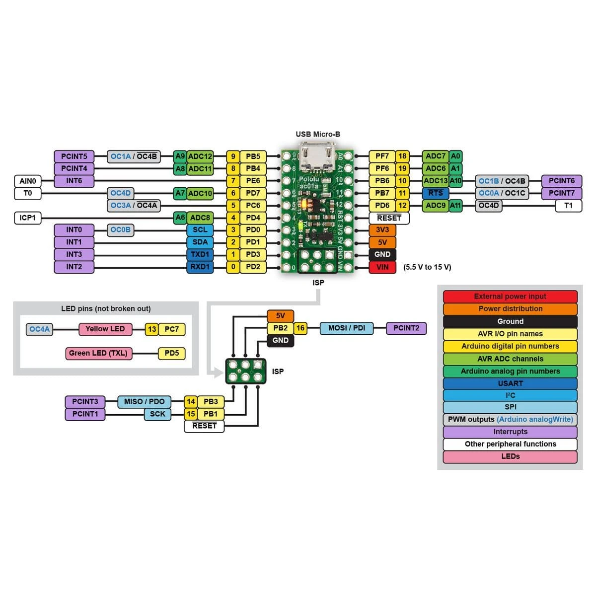 This diagram identifies the I/O and power pins on the A-Star 32U4 Micro; it is also available as aÂ