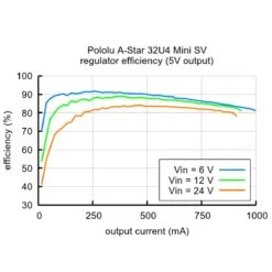 The A-Star’s components, including the microcontroller and LEDs, draw 30 mA to 40 mA in typical applications. The rest of the regulator’s achievable output current, which depends on input voltage as well as ambient conditions, can be used to power other devices. The green line in the graph above shows the output currents where the regulator’s output voltage drops below 4.75 V. These currents are close to the limits of the regulator’s capability and generally cannot be sustained for long periods; under typical operating conditions, a safe limit for the maximum continuous regulator output current is approximately 800 mA.