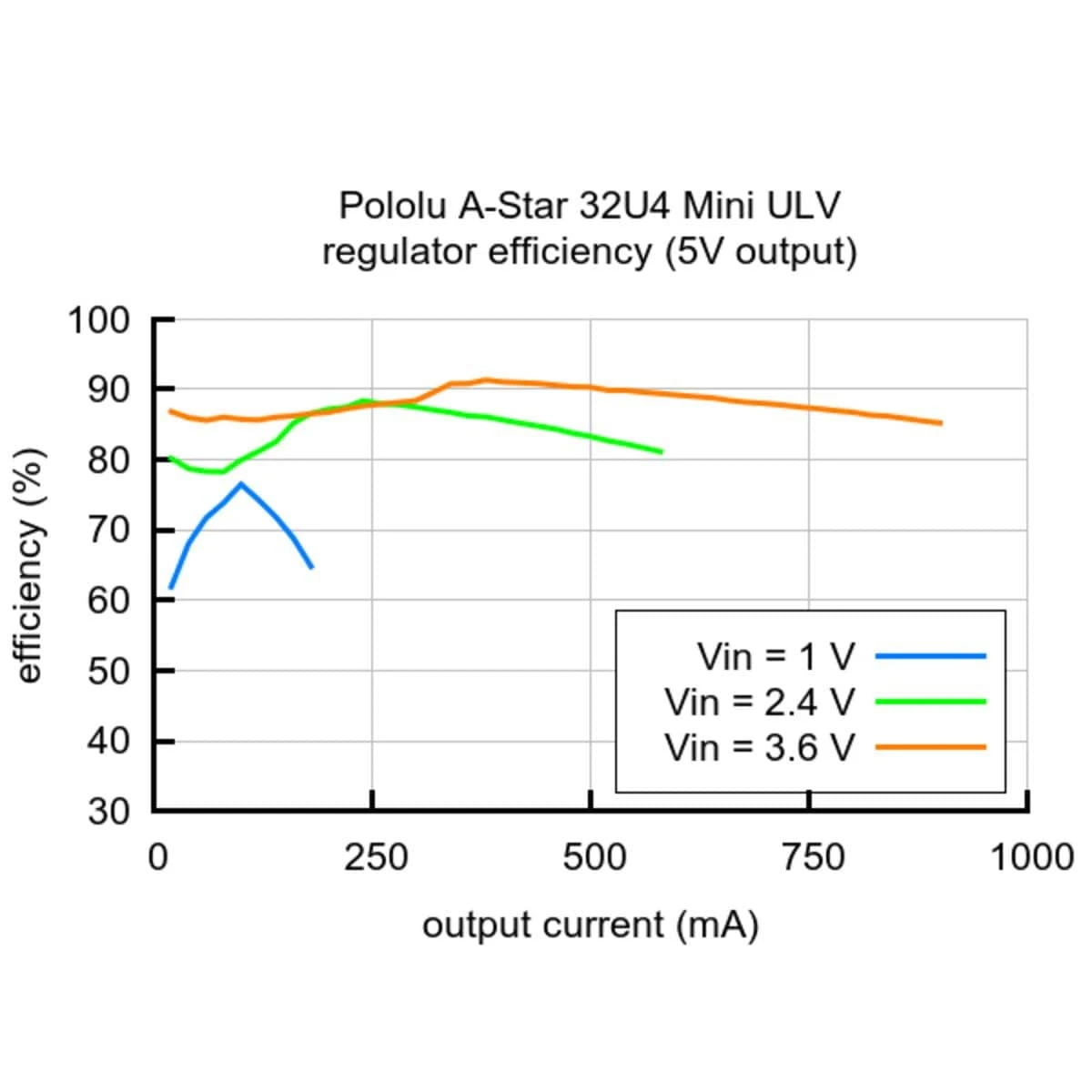 This version, the A-Star Mini ULV, can be powered from a 0.5 V to 5.5 V external source. The input voltage is regulated to 5 V by a TPS61202 switching step-up (boost) converter from Texas Instruments.