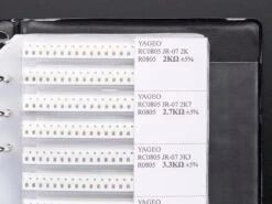 Always have the right SMT components at your hand with this awesome 0805 Resistor and Capacitor book set! This book has nice translucent pages filled with cut tape SMT 0805 components, sorted, labeled and ready to go. This book has 63 5% resistor values, 3025 parts and 17 capacitor values, 700 parts. The nice thing is that you get a good distribution of the resistors, with more 1K and 10KΩ and fewer of the really high values.