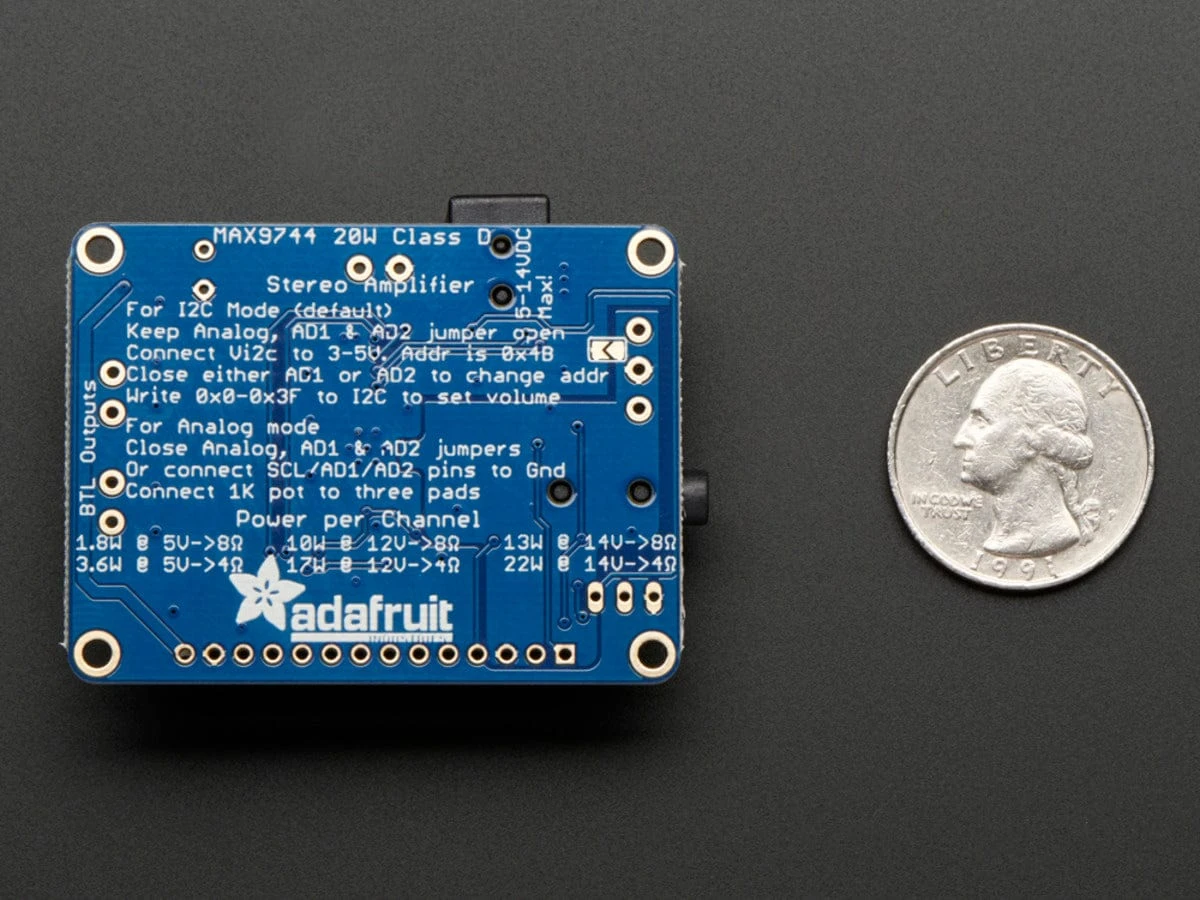 We like the MAX9744 amplifier at the heart of this board because its very easy to use, but it also has both analog and digital volume control capability. Use a single 1KΩ pot (we include one) to adjust volume analog-style. Or hook it up to your favorite microcontroller and send I2C commands to set 64-steps of volume amplification.