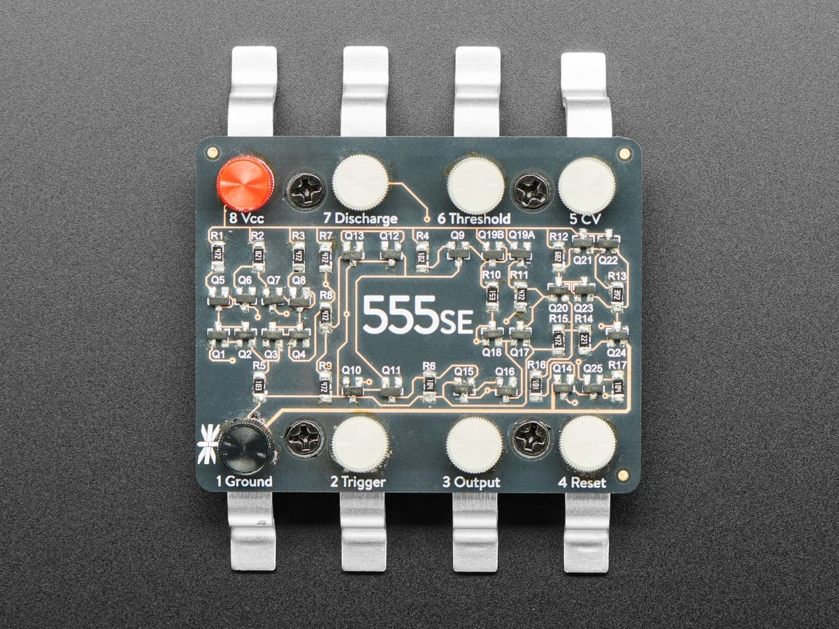 The Three Fives kit was designed by Eric Schlaepfer, in collaboration with EMSL. The kit is lovingly designed to resemble an (overgrown) integrated circuit, based around a black circuit board with clear solder mask so that you can see the wiring traces between the components. It comes complete with a beautiful aluminum display stand that gives the circuit board eight legs in the shape of SOIC-packaged integrated circuit pins. If you’re already familiar with the larger DIP-IC styled Three Fives kit, you’ll find the 555SE to be smaller and built to the same scale, with half the lead pitch, and all surface-mount components.