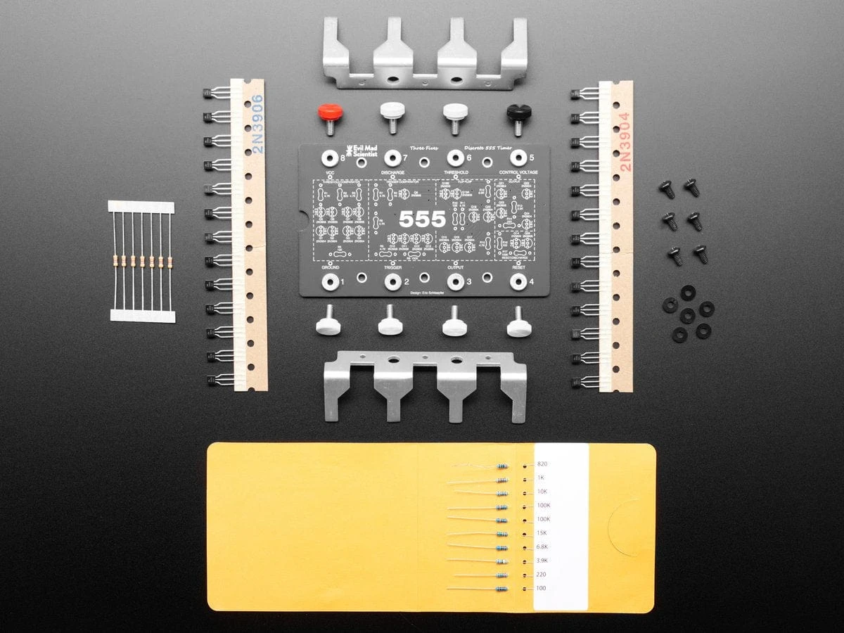 The Three Fives kit is sold as an easy-to-build soldering kit [?]. It includes the circuit board, resistors, and transistors that make up the electrical circuit as well as printed assembly instructions. The kit also comes complete with the “IC Leg” stand, and 8 color coded thumbscrew terminal posts.
