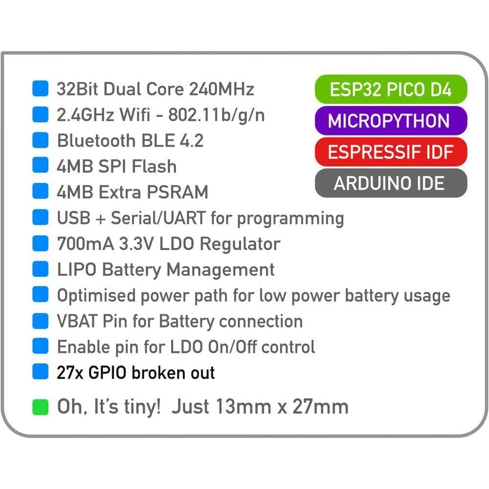 No compromises! The module packs a massive 700mA 3.3V regulator, on-board battery management, 4MB of extra PSRAM and 27 GPIO!